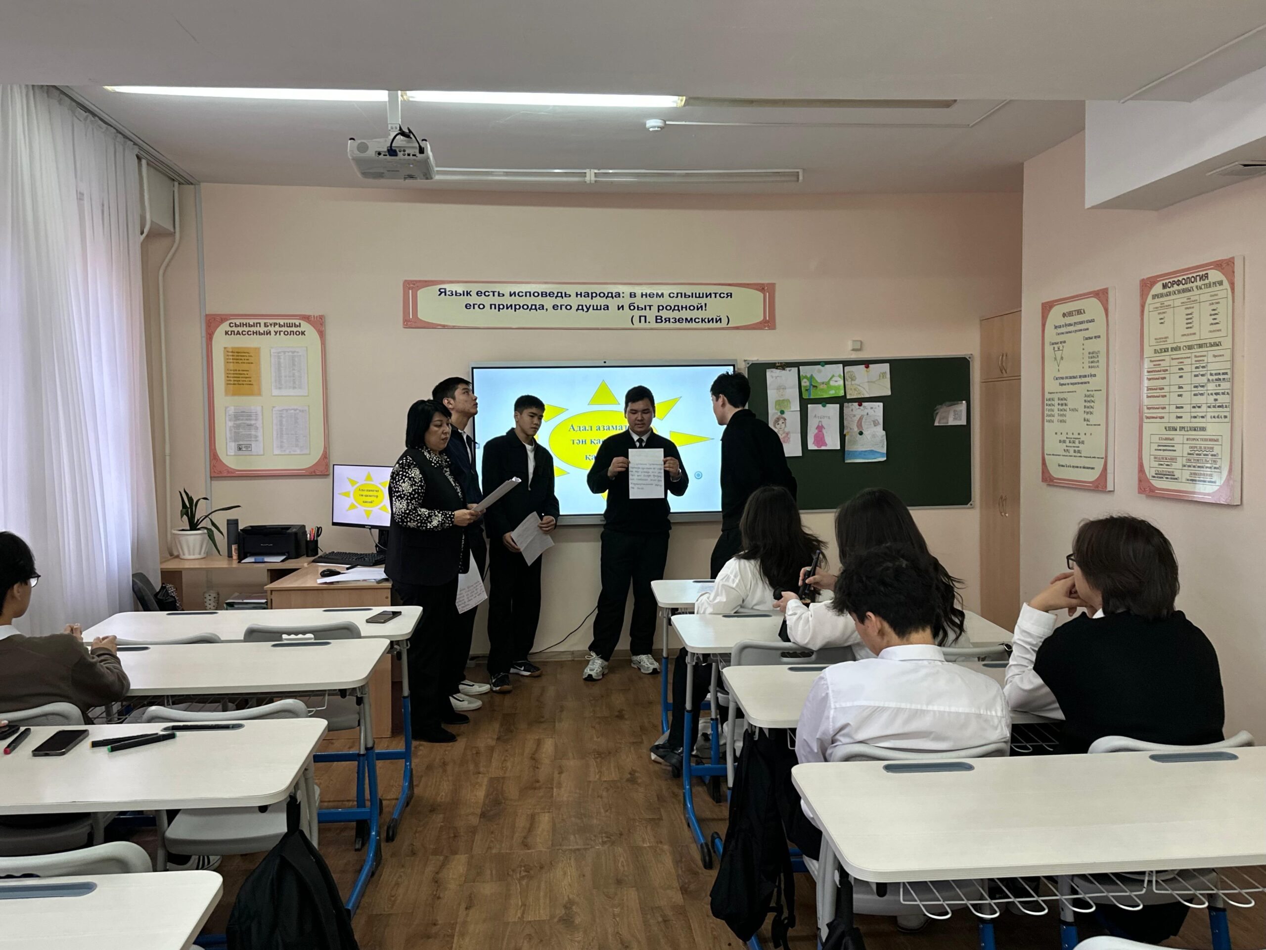 Сынып сағаты барысында мұғалім оқушылармен жылы амандасып, назарларын сабаққа аударды. ҚР Мемлекеттік Гимні орындалып, оқушылар топтарға бөлінді. Сабақта сұрақ-жауап, талқылау, ой қозғау, мақал-мәтел талдау және эссе жазу әдістері қолданылды. Топтық жұмыс барысында оқушылар «Адал адам – қоғам тірегі», «Адал еңбек – табыстың кілті», «Адал қоғам – әділ мемлекет» тақырыптарында постерлер мен кодекстер дайындады. Қауіпсіздік сабағында оқушылар зорлық-зомбылық түрлерімен, олардың белгілерімен және қорғану жолдарымен танысты. Мұғалім көмек сұраудың маңызын түсіндіріп, рөлдік ойындар арқылы көмекке жүгіну тәсілдерін көрсетті.